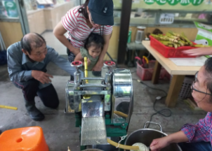 1.活動目的:現場將展示傳統粿切的作法,為了讓糯米塊脫水,口感自然Q彈,以長竹將糯米粿袋綁壓在板凳上,長時間加壓瀝乾糯米糰水分。